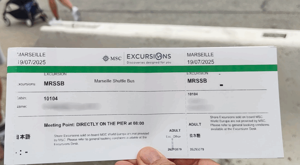 クルーズ通信(添乗員さん作)に書いてあったのに、持ってれば間違いないだろう的な考えで何人もの人が集合場所にこのチケットを持ってきていたので、添乗員さんが「クルーズ通信読んでくださいよ~」と何回も受け答えしているのが笑えました。かくいう私も見せはしなかったけれどカバンには入れてありました(笑)