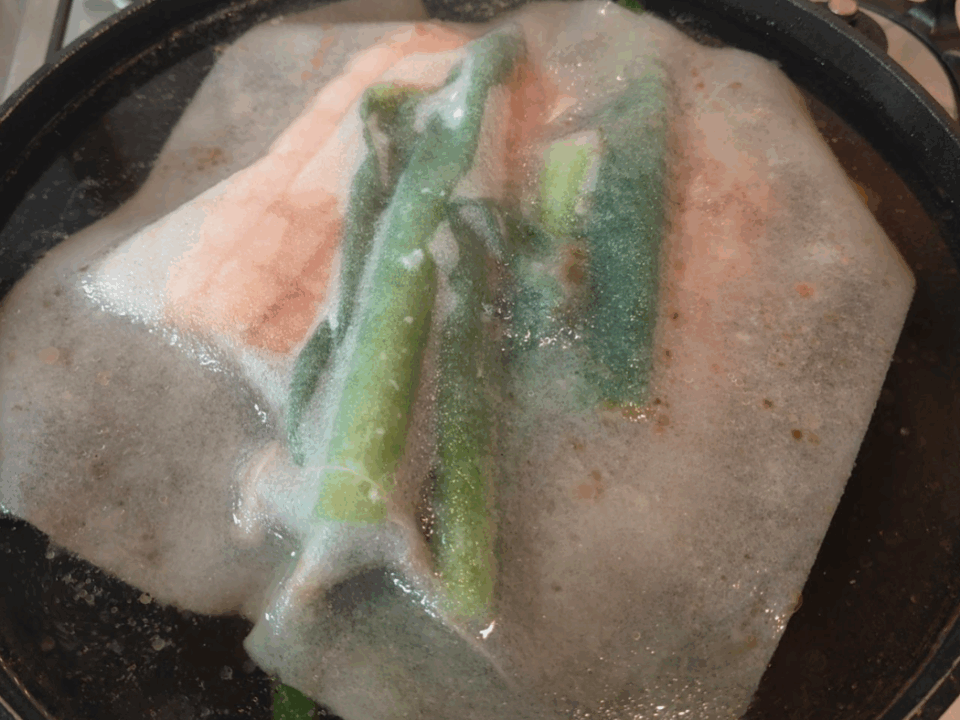 肉が水面からでてしまうようなら、キッチンペーパーで落し蓋をする。