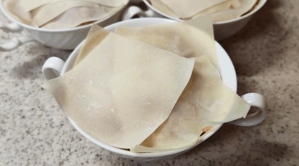 器が深ければ、1枚を肉ダネの間にもサンド。